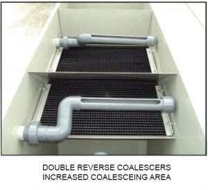 - Reverse Lamella Coalescing pack that separates free oil from water through coalescing. Solids are allowed to be flushed through coalescing media via reverse flow (downward) while creating increased contact of oil with media. Free oils float and solids traverse downward.